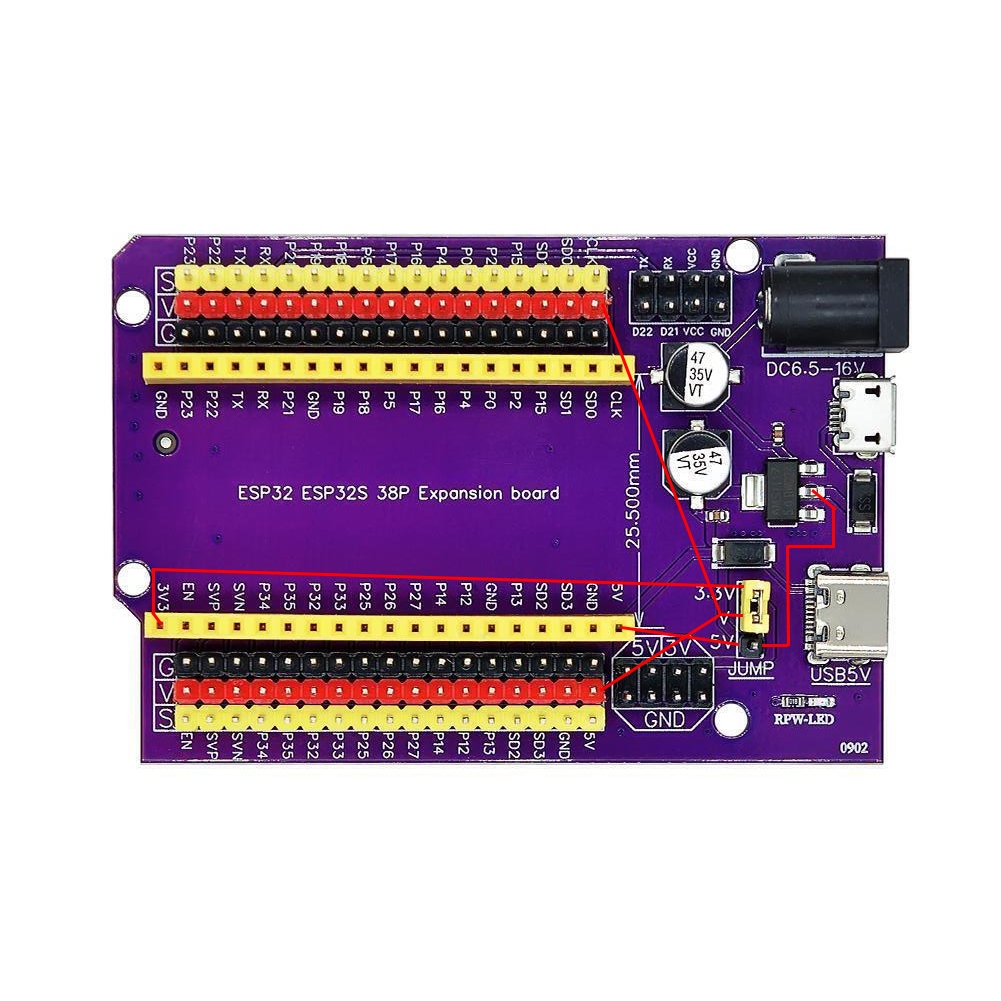 Viz přiložený obrázek. Jen přepíná obě červené řady propojovacích pinů označené jako V na desce mezi pinem 3.3V a 5V na žlutém konektoru pro připojení ESP32. Obě červené řady propojovacích pinů jsou určeny jako plus pól napájení periferií.