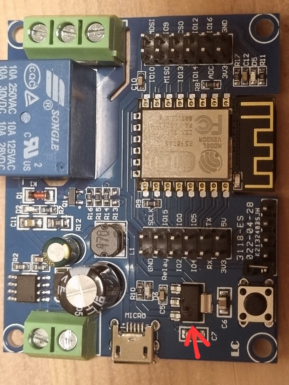 Při testování na 30V shořel díl viz šipka na fotce. Teď ale vizuálně nic neodešlo, jen přestala svítit modrá LED wifi u chipu a chip se hned po zapnutí extrémně zahřívá už při 5V.