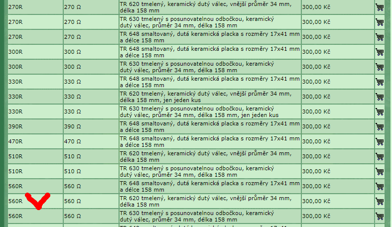 Počkej, počkej - TR620 je typ toho rezistoru, kterej udává jeho rozměry, materiál a výkon kterej snese - to je těch 100W. Ale HODNOTU má mít 560Ω jako na tý fotce???? _________________ Nasliněný prst na svorkovnici domovního rozvaděče: Jó, paninko, máte tam ty Voltíky všecky...