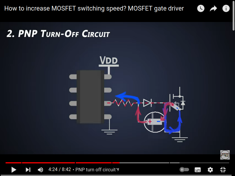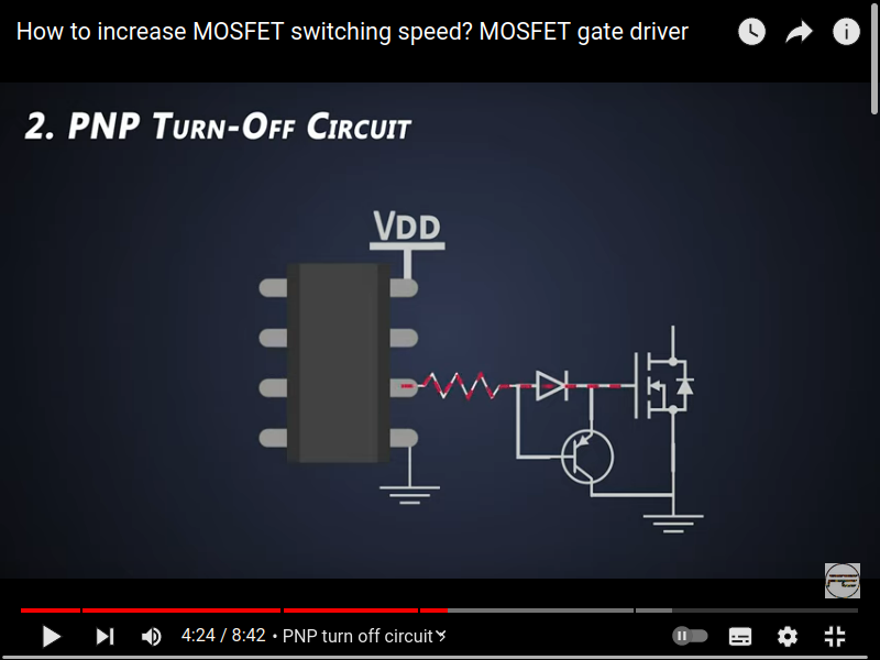 Ten tvůj poslední obrázek je zmatečný. Zobrazený obvod funguje tak, že pokud je na výstupu IC log.1, dostane se napětí na G Mosfetu a tím pádem se otevře kanál D-S. Mosfet je otevřený (pokud je napětí Ugs dostatečné, kanál se otevře naplno a proud v přechodu D-S je limitovaný jen parametrem Rds) a proud teče. PNP tranzistor se neuplatňuje. Jakmile zanikne napětí na výstupu IC, tak se uplatní PNP tranzistor (napětí na B je menší než na E), otevře se přechod E-C a vybije náboj z G mosfetu do GND. Tím urychlí vypnutí mosfetu.