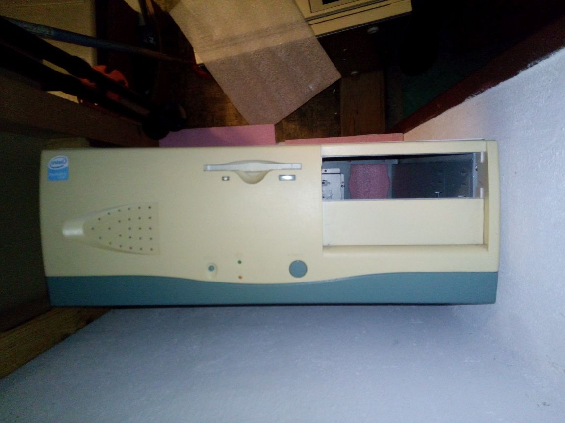 Popisovaná skříň koresponduje na míru vyrobenému stolu (styl Žďákovák), Very Happy viz foto (cca 2005). Deska stolu má 120×70cm a vychází dva prsty nad kolena, pokud před PC sedím na konkrétní dedikované židli. To abych na monitor (FE1250) nehleděl příliš shora, či zdola. Lamino (do U) pod monitorem je odejmutelné. Vpravo trůní skener, vlevo měla být tiskárna. Hanbatá myš vpravo, volant vlevo, klávesnice Silitek (nemembránová - záchodozvonová, z roku '90, překopaná na PS2) vpředu. Na temeni Creative Webcam Pro (tenkrát za 1500Kč), v pozadí police s repro. Mezi lety 2000..2005 bylo skříní v tomhle stylu na trhu víc, ale buď byly moc rozměrné, nebo nehezké. A bída univerzálních skříní PC trvá dodnes.