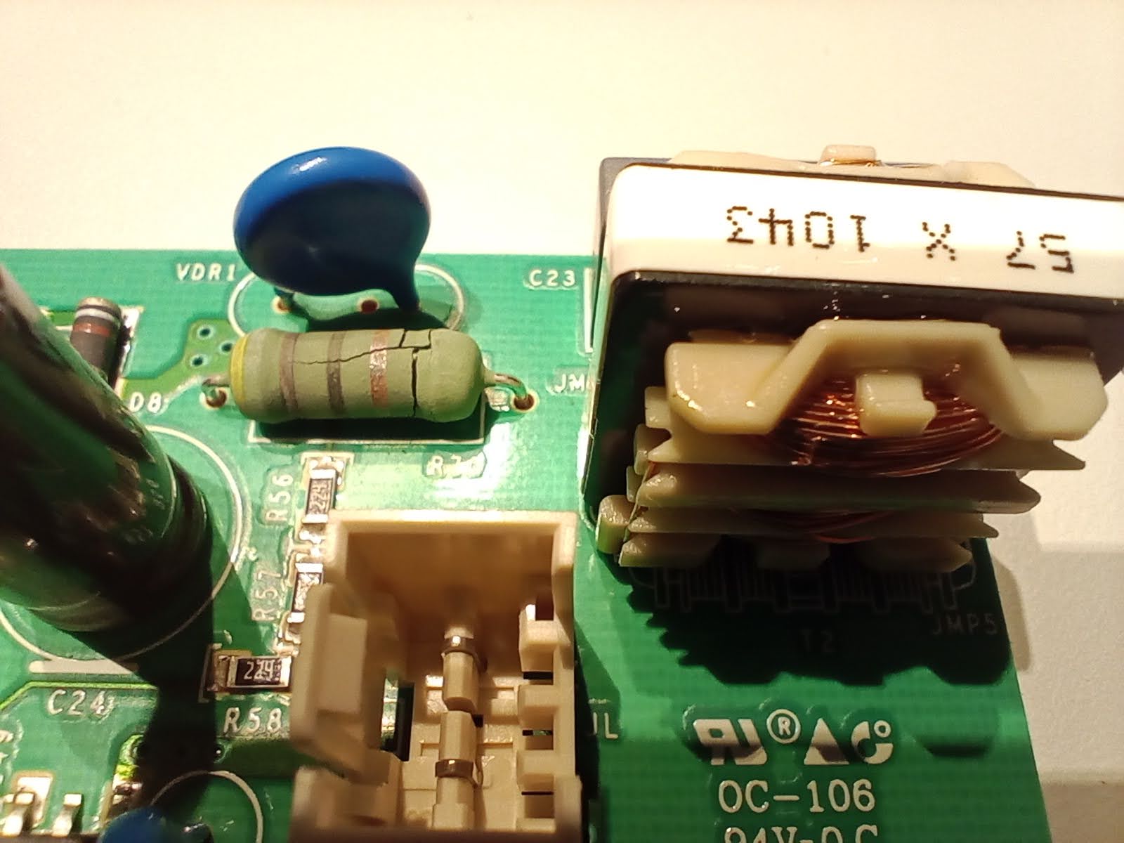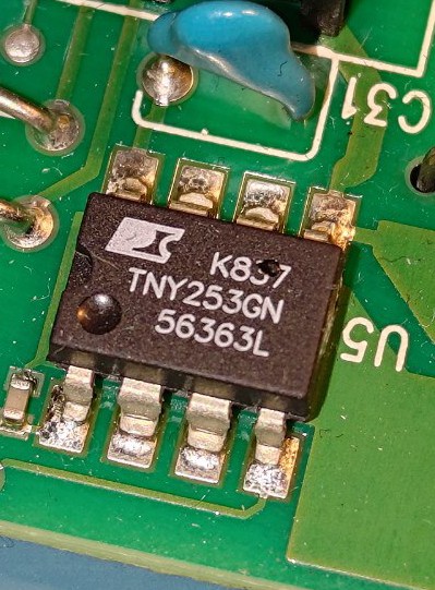 Tak fotka na které je vidět vše potřebné. Možná píšu zbytečně ale zmíněný odpor funguje jako rádoby pojistka, brouk který je za ním a vyrábí napájecí napětí bude skoro určitě zdechlý, nutno vyměnit.
