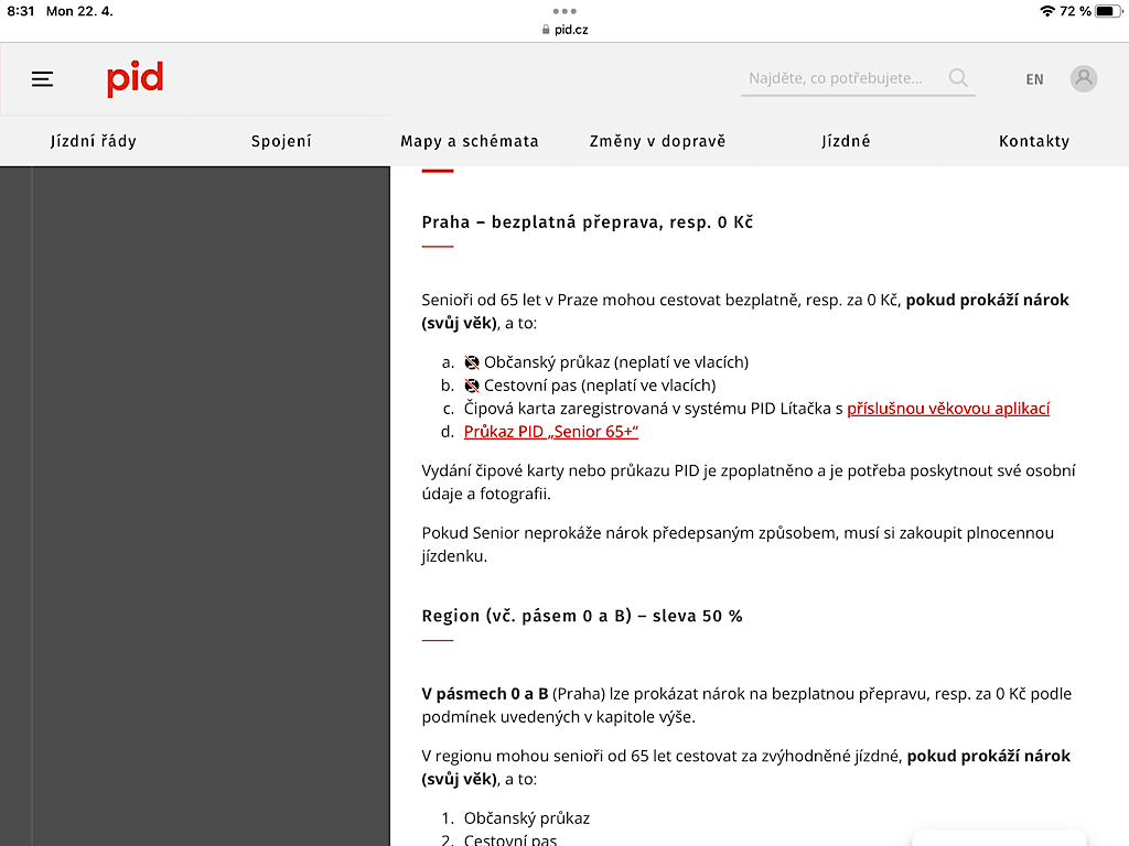 Senioři od 65 let cestují po Praze bezplatně vyjma vlaků, pokud prokáží věk předepsaným způsobem.