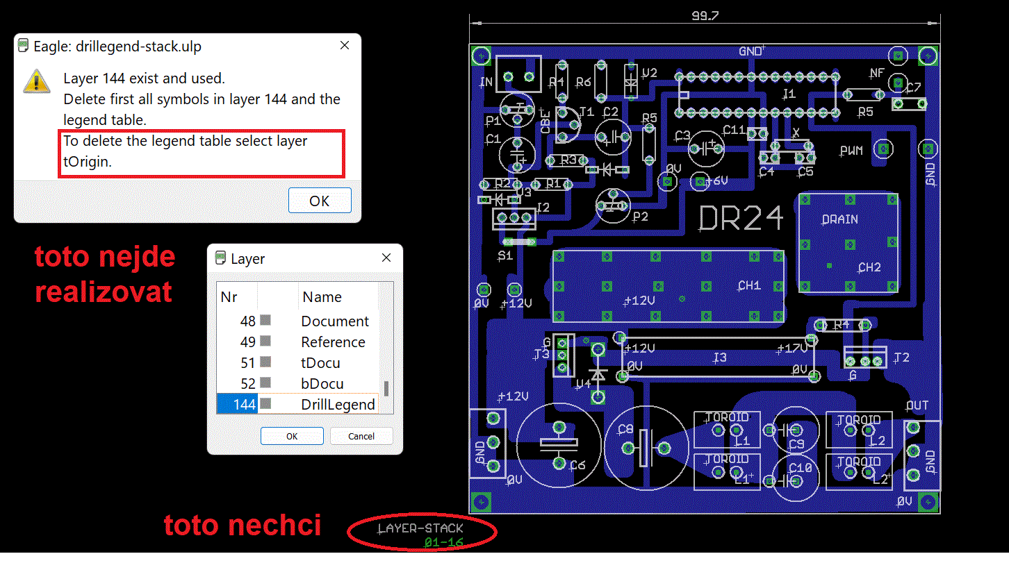 V tom přehledu vrstev zviditelni jen vrstvu 144 a vymaž z ní všechno, co jde. Pak přidej vrstvu 23 a vymaž zbytek. Potom půjde otevřít okno Drill legend.