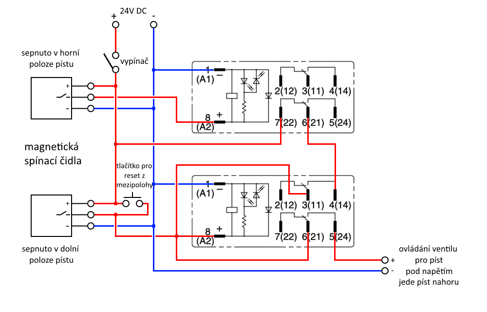 Sepnutí relé, dojetí pístu k magnetickému čidlu, počkat cca 3 sekundy a vypnutí relé.