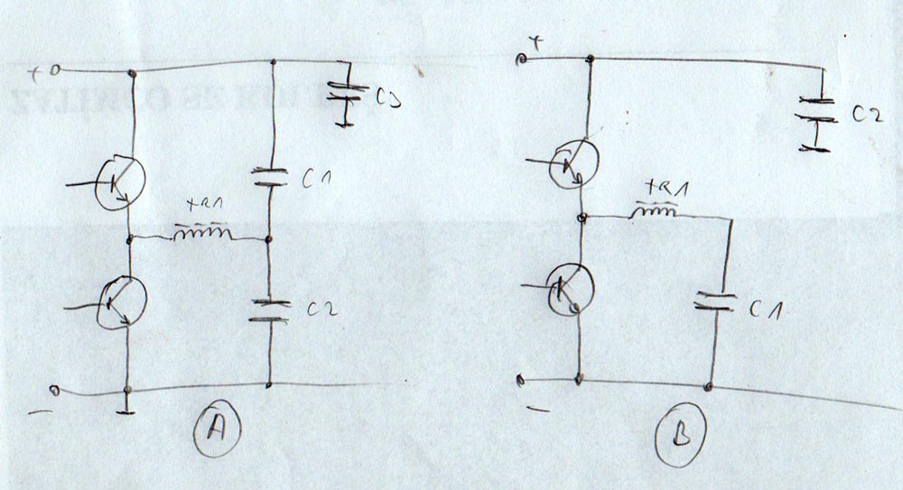 Varianta A využívá toho, že uzel C1, C2, TR1 si nastavuje sám od sebe přesně polovinu napájecího napětí Ub. A je to tvrdý zdroj napětí, nesmí s ním znatelně hýbat proud primárem Tr1.