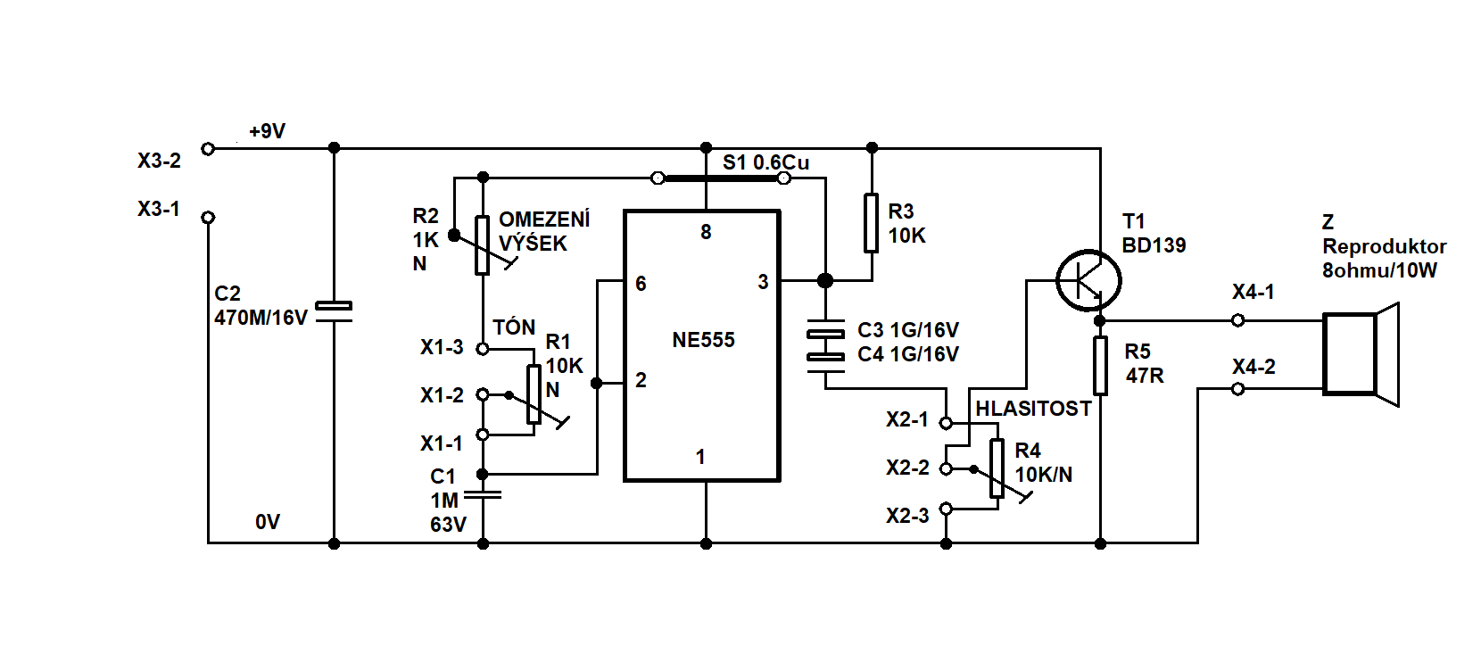 O mnoho veselejší by bylo ten potenciometr zapojit mezi vývod č.7 NE555 a + napájení. Pak by měl člověk větší hlasitost a ušetřil by dva kondenzátory. A ušetřil by i ten 10k odpor na nožičce č. 3.