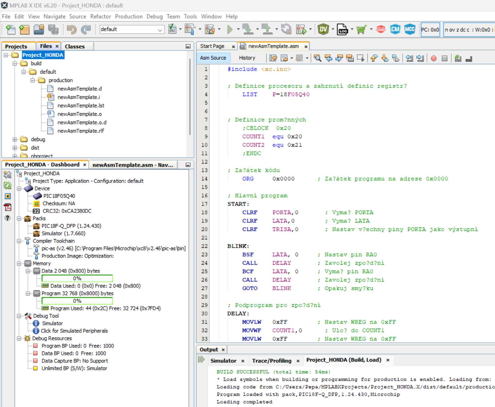 můj život je v troskách. Příležitostně jsem si doteď programoval staré PICy v MPLAB IDE 8.92 v assembleru a všechno bylo krásný. Jenže teď stavím malý projekt na motorku a naprosto neuváženě jsem použil moderní PIC18F05Q40 a až příliš pozdě (když už mám hotovou a osazenou desku a zbývá jen programování) jsem zjistil že můj starý dobrý MPLAB tento čip již nepodporuje a musím se přesunout na MPLAB X. Tady začíná peklo. Z nějakého důvodu již není podporován pro můj čip MPASM a je dostupný pouze překladač XC8. Nedokážu napsat sebekratší program v asm aniž bych při pokusu o překlad nedostal chybu snad na každém řádku. Chci zůstat u asm, nechci C.