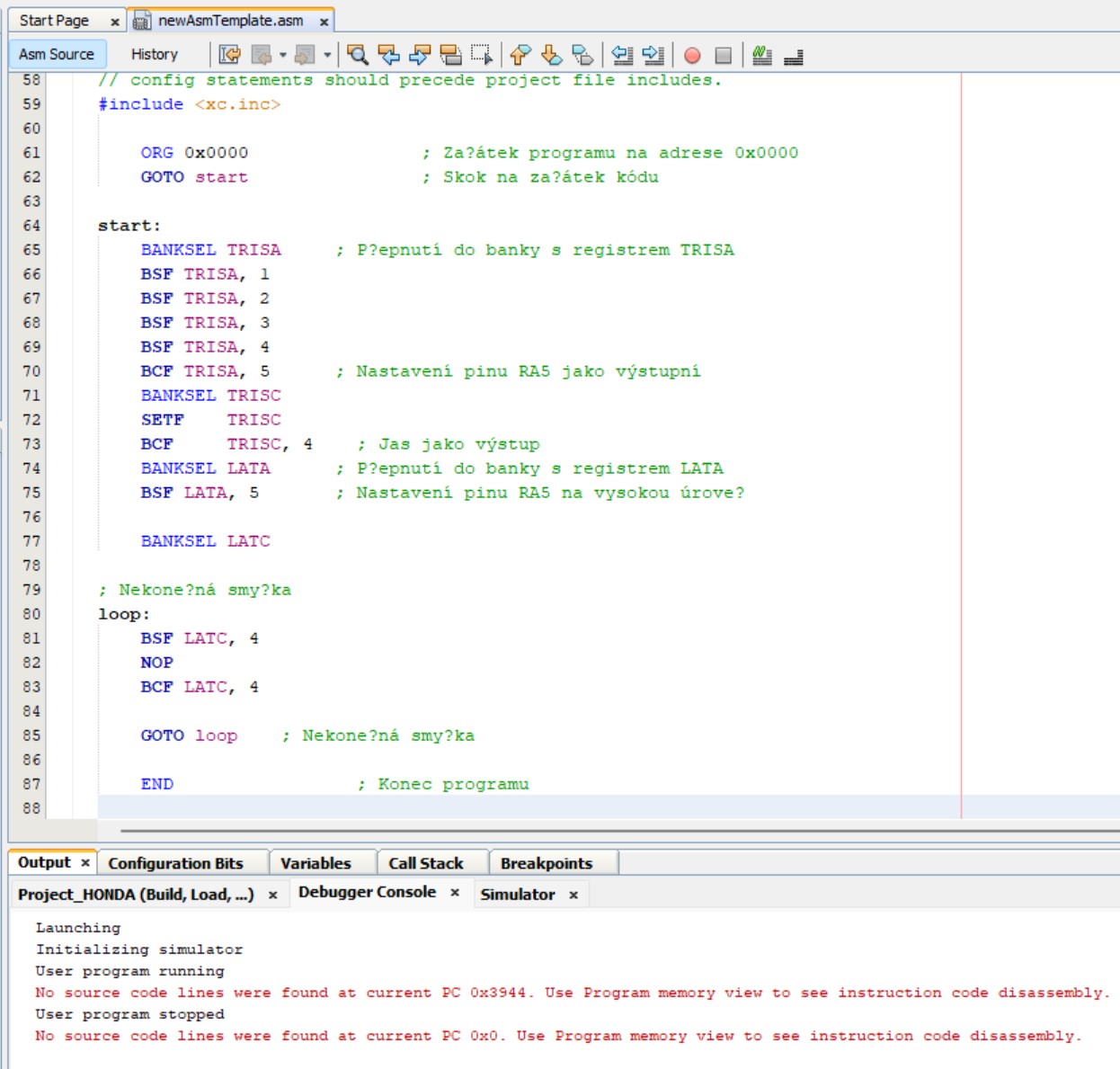 Ukázalo se že je v MPLABu nějaký krutý bug, jelikož pokud se pokusím program odsimulovat, dostanu chybu že na počáteční adrese 0x00 není žádná instrukce kterou by šlo vykonat.