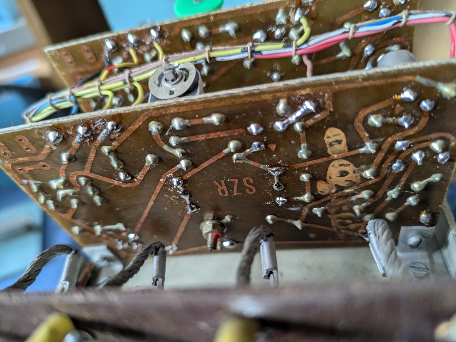 Já nic nic bohužel neměřil, ale jinak jsou proměřeny všechny součástky a výsledek je OK (měnil pár kondíků, ty černé, těžko viditelné na fotografiích). Až bude čas, tak se budou měřit všechna spojení. Mohu ho požádat aby to ve čtvrtek více nafotil a hodím lepší fotky. Třeba to někomu poslouží