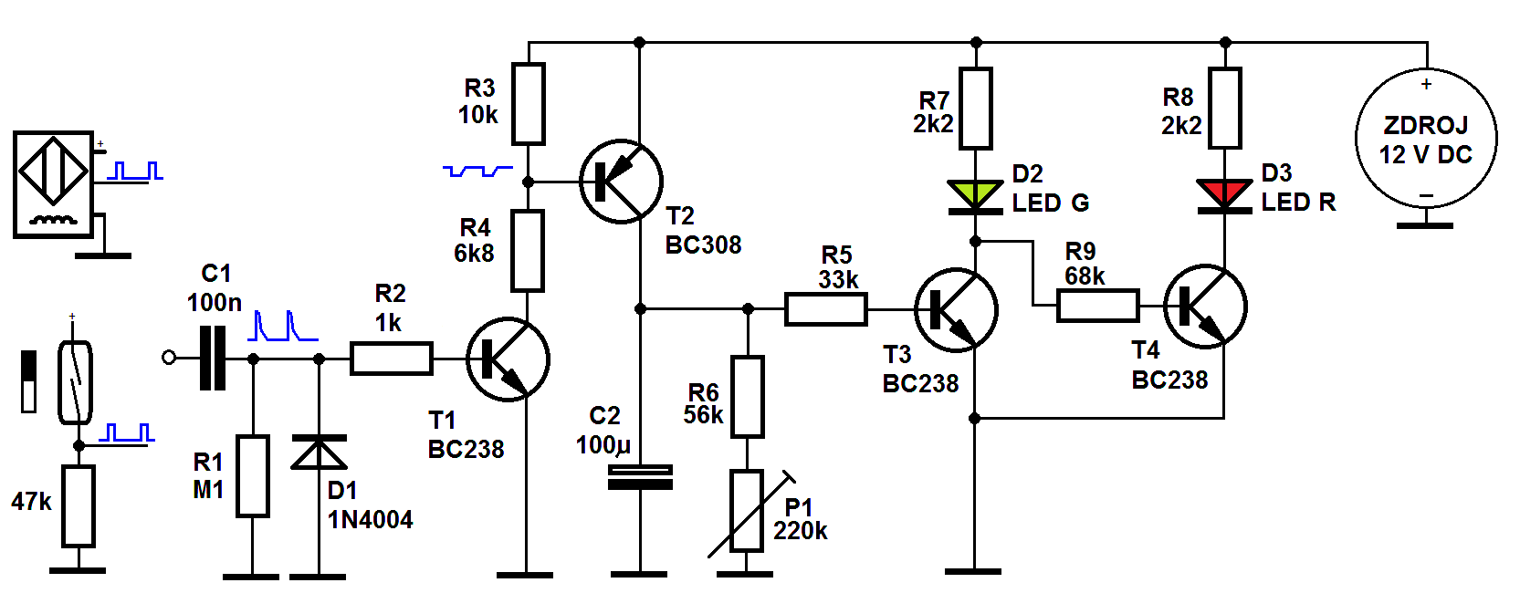 Dokud se mění napětí na vstupu, nabíjí se C2, toto napětí udržuje tranzistor T3 otevřený a D2 svítí.