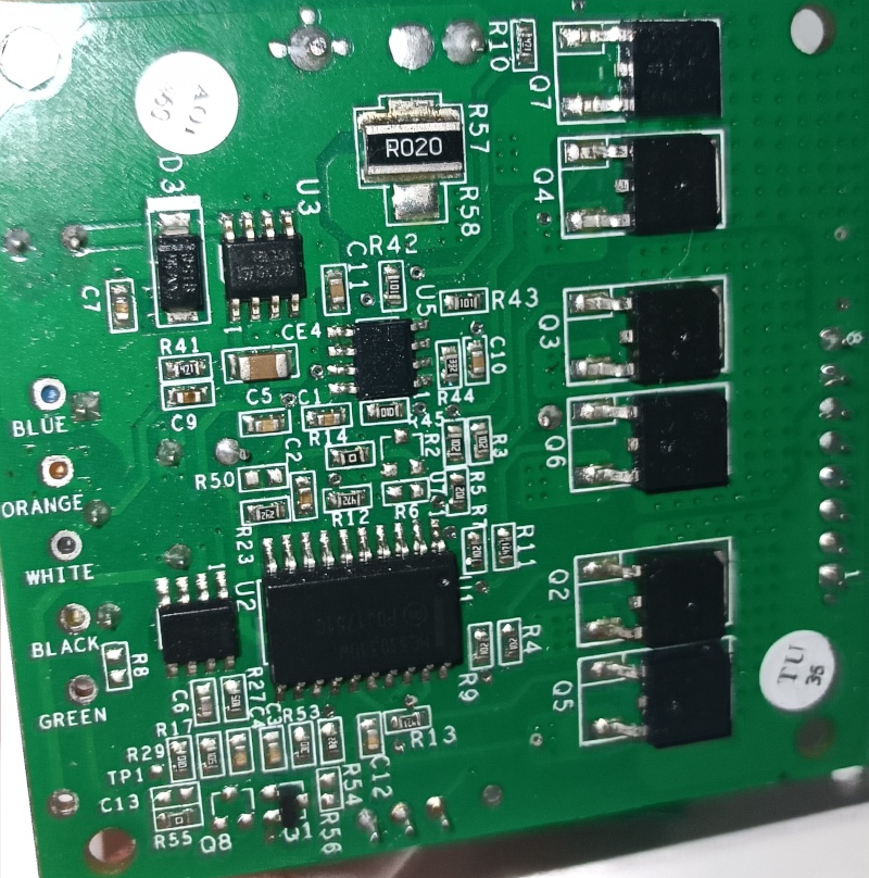 Budu vařit z vody, ale pravděpodobně to má BLDC motor a toto je trojice MOSFETů na jeho řízení. Pokud se to nepodaří identifikovat, tak bych oměřil, jestli je to opravdu tak a vybral nějakoui vhodnou dvojci P a N-MOSFETu. Napětí i proud půjde docela dobře odhadnout z parametrů motoru.
