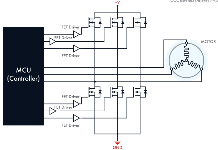 No vypadá to, že to má tři tlustší dráty na vinutí, takže BLDC asi ano. Co těch dalších 5 ale netuším. Asi to bude zapojený podobně jako na obrázku. Tu jsou ale všechny tranzistory stejný, Ty tam máš tři a tři stejný?