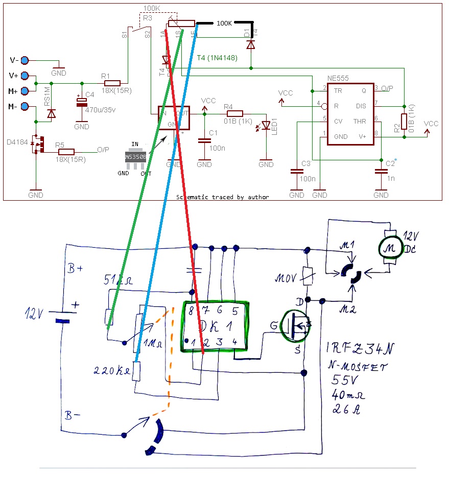Dané zapojení časovače se vyznačuje tím, že ve středové poloze běžce potenciometru je střída impulzů 50% a výkon je tedy poloviční (platí pro lineární potenciometr). Pokud tedy nemáš k potenciometru nic jiného připojené (druhý potenciometr), mělo by tomu tak být i v tvém případě. Motorek se obvykle rozbíhá až při nějaké prahové hodnotě střídy (výkonu) než překoná mechanické odpory. K vymezení tohoto "mrtvého chodu" lze do přívodu od D1 k potenciometru zařadit odpovídající rezistor. Např. pro potenciometr 100kΩ a rezistor 100kΩ bude rozsah regulace od 50% do 100%.