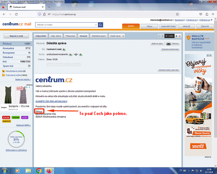 Přišla mi na můj email na centrum.cz vyzva k jeho aktualizaci. Není to podvod?
