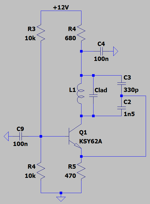 Urobil som modifikáciu - zvýšil som rezonančný odpor v kolektore a tým aj zosilnenie, t.j. amplitúdovú podmieku. Odpor 680R som ponechal iba ako napájací, aby zostal zachovaný kolektorový prúd (strmosť). V podstate som to zapojil tak, ako je to v AR76/8 s.308. Ako záťaž je rezonančný obvod, takže tranzistor má oveľa väčšie zosilnenie.
