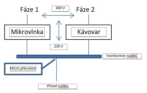 Udělal jsem velmi amatérský situační "Náčrt 1" problému. Z toho je vidět, že pokud se odpojí nulák, a spotřebiče jsou ve stavu Standby (na displejích svítí hodiny), tak se asi spotřebiče poškodí z těch 400 V.