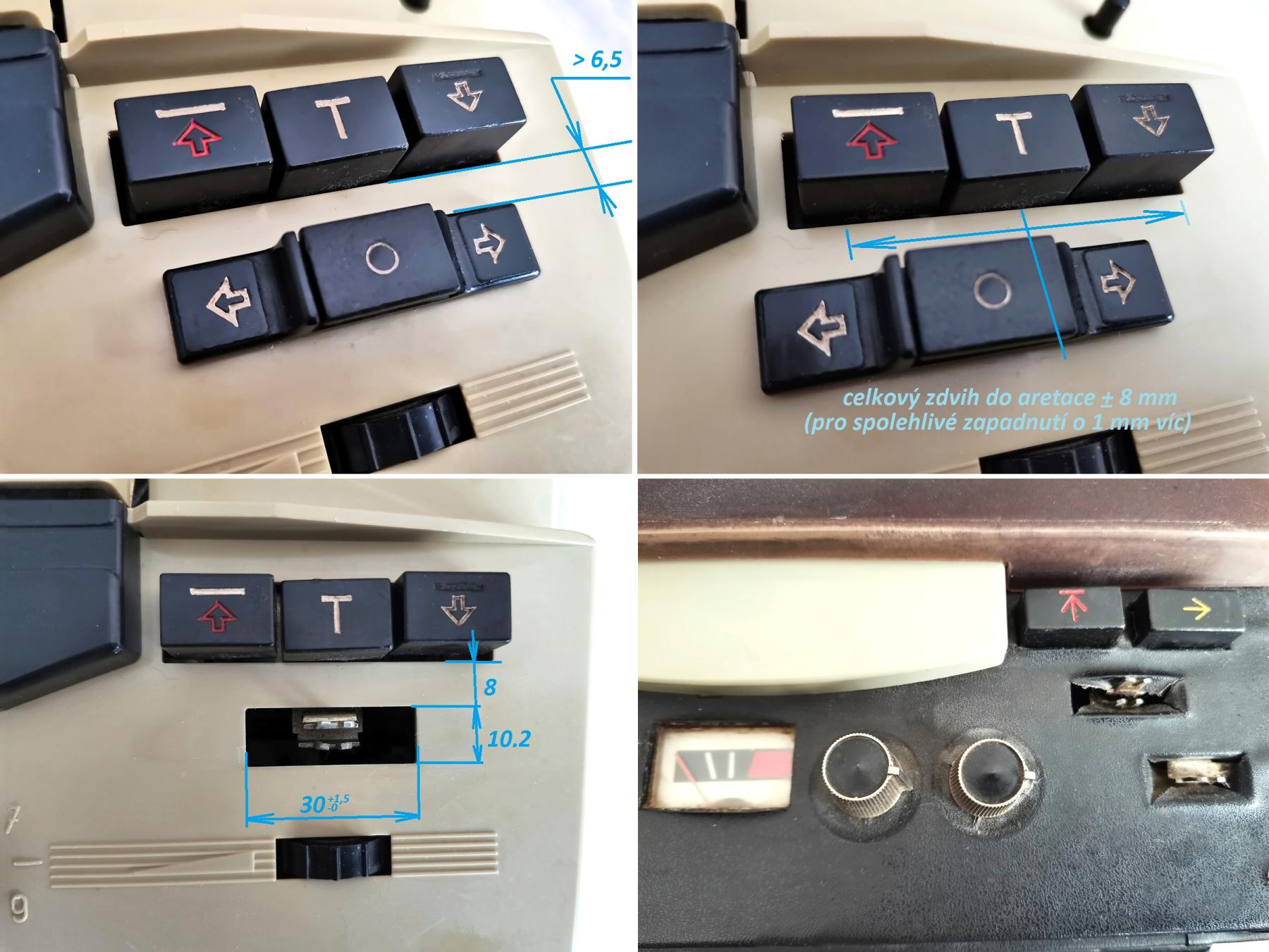 To vypadá náramně dobře, tak jsem ještě přeměřil velikost díry, celkový rozhup šoupáku (potřebuje asi o 0,5 mm přes aretaci, aby spolehlivě zaskočil i v lehce ojeté mechanice) a vzdálenost mezi dírami pro šoupák a tllačítka.