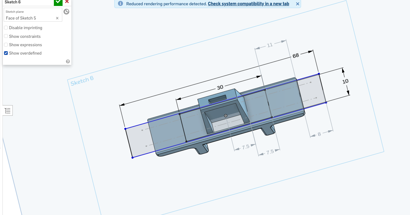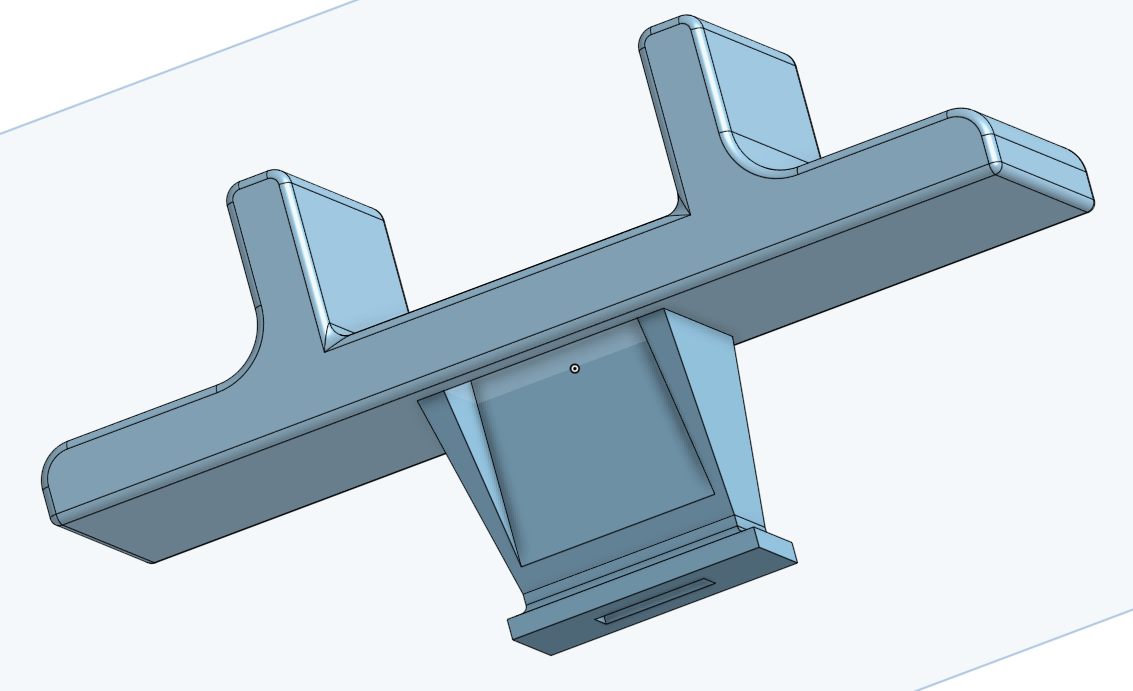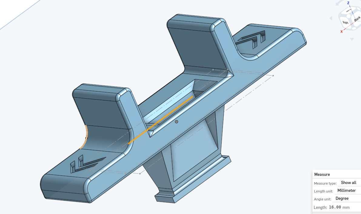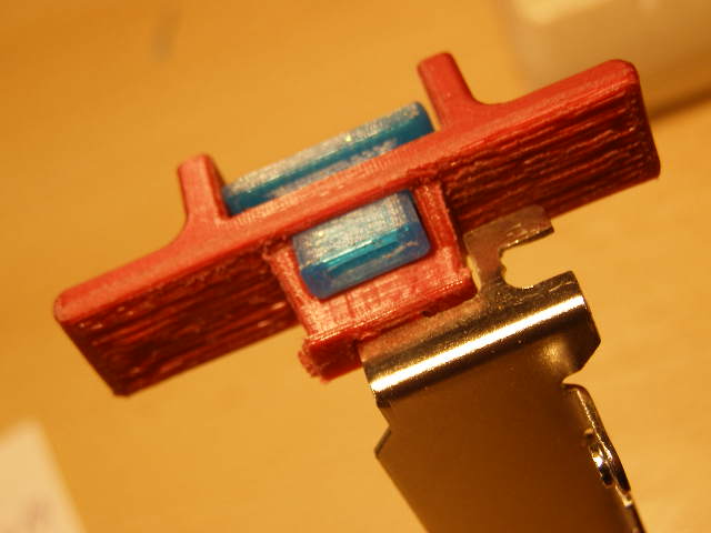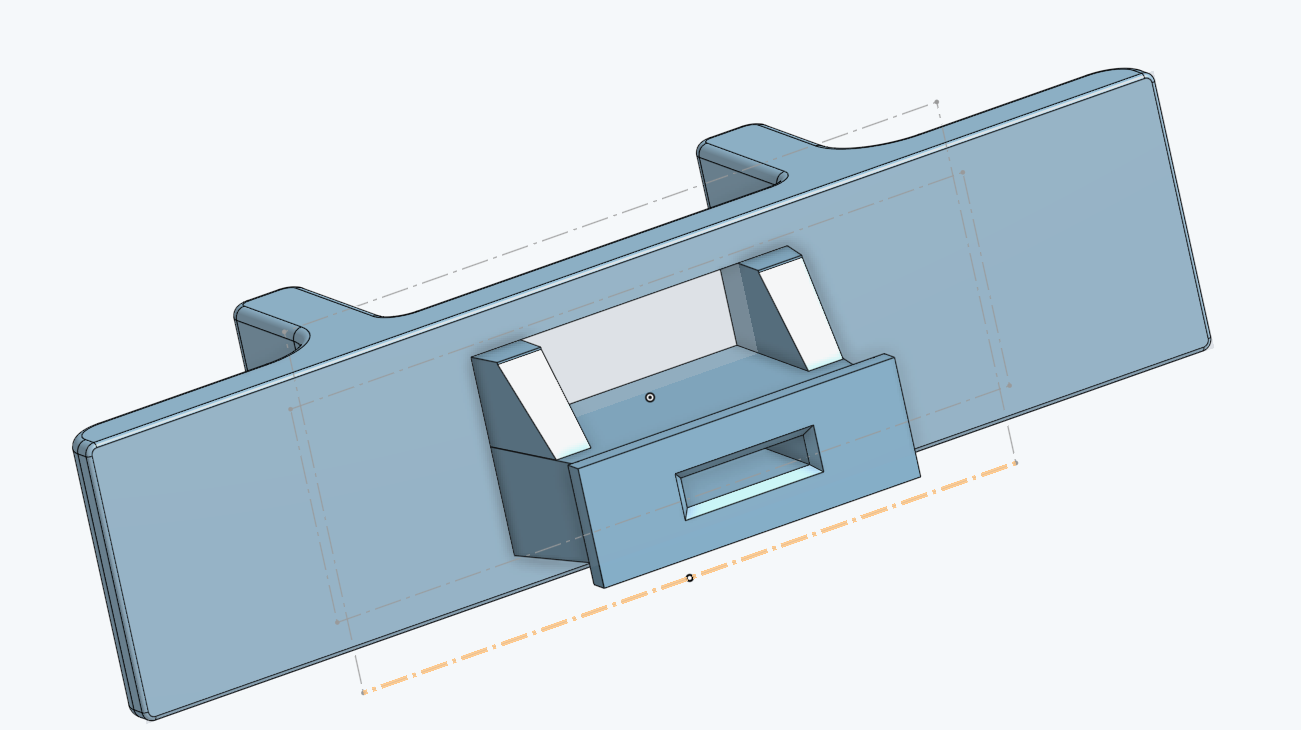 Tak, že rekapitulace. Posuvník rychle vpřed/zpět B4 má rozměr 54x13 je do propilované díry v krytu na 34x10. Středy komínků obou tlačítek mají rozteč 4.5mm. Rozměr komínku je upraven z bratru 10x4,2mm na 16x4,6 a dále opatřen rantlem pro omotání nití aby nit nepadala. Zalakovat! To pak nejde roztrhnout. Možná nebude třeba omotávat a PLA to udrží. Tisknul jsem „na lešení“, výška vrstvy 0,15, teplota 215/65, plnění 40 procent, rychlost první vrstvy jsem snížil na 10. Sežralo to asi 2m struny a trvalo celé 1h +15min. Vyšlo to OK. Průvlak na tlačítko STOP je na těsno aby se účastnil tahu do strany, tak doladit diamantovým pilníkem. Trochu mam obavu jestli to nebude dřít v místě toho trojúhelníku výztuhy na obrázku. Dělal jsem v tom ještě drobné úpravy tak doufám, že tam není nějaká zanesená chyba.