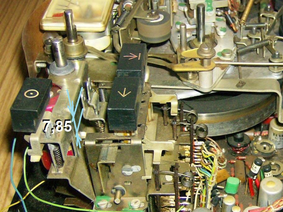 Ještě prosím změř vzdálenost konce kovové packy do strany od hrany díry v krytu v pozici rychle vpřed/vzad. Přidáme ten 1mm na zaskočení. Co zbyde dáme výztuhu.Hranu kovové packy stop od díry v krytu ve směru k tlačítkům záznam a reprodukce. Také hranu druhé packy směrem k díře v krytu (k sobě).