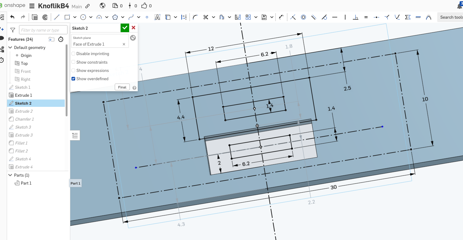 Zmenšil jsem díru pro nasazení obou tlačítek na plech 6x1, trochu to vaklalo. Změř prosím potřebnou hloubku, zbytek dáme do výztuhy. Někde mám ale patrně chybu v rozteči obou pacek. V jakém rozsahu může být tato rozteč aby to nedřelo? Zatím je 4.8mm. Poslední varianta posuvníku má délku 54mm a je pro rozpilovanou díru 34x10. Komínek s výztuhou má u paty 16mm, to by mohlo držet i z PLA. Jestli se někdo z borců, kteří exhumují magiče řady B4 chce zapojit do testování, budu rád. Když už jsme tomu věnovali čas tak ať je to plně použitelné. Já to nemám na čem vyzkoušet. Zatím má xxx.stl okolo 3.5Mb, tak na email.