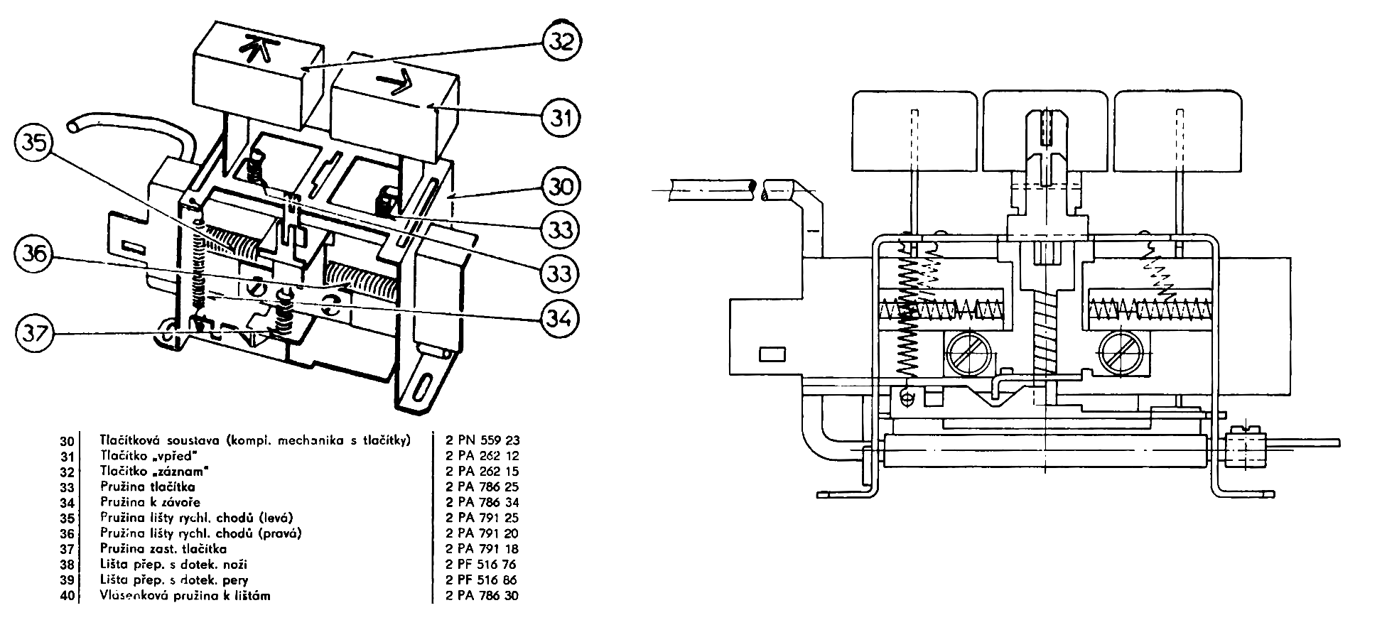 Ta nestiskací, tedy namáhaná boční silou, je dole, vyšší je od tlačítka, které se unáší s sebou a slouží jen k odklopení závory všech tlačítek i jezdce, tedy jeho boční namáhání je minimální.