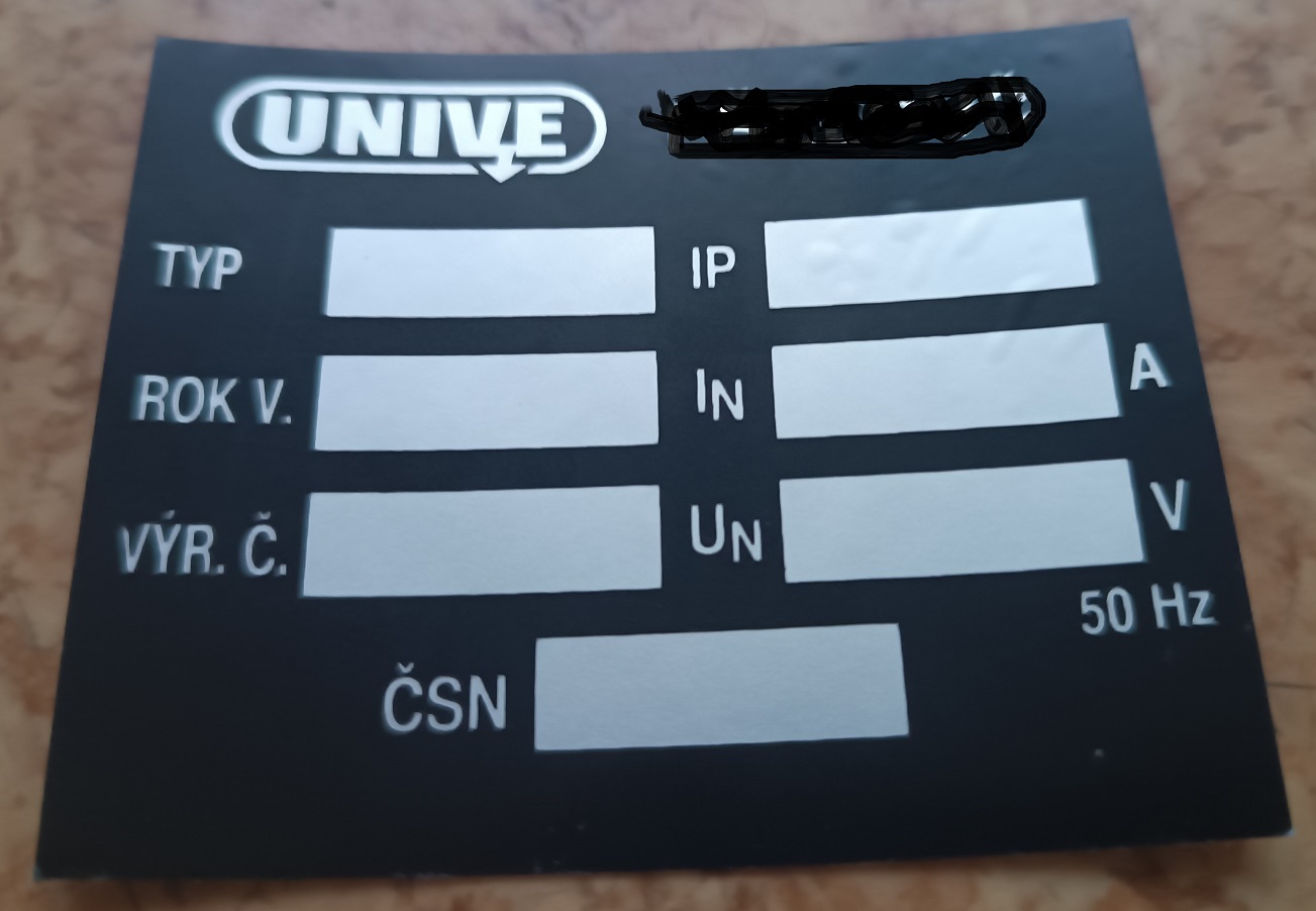 V devadesátkách jsme si zadali v jedný reklamce štítky na rozvaděče ve stovkách kusů. Je to Al samolepka tlustá 0,3 mm na který je sítotisk s vokýnkama, kde se údaj vyrazil razníkama. Jednu jsem právě zkoušel nalepit a lepidlo je furt OK. Reklamka ale už nefunguje asi 10 let, takže jiný info neseženu.