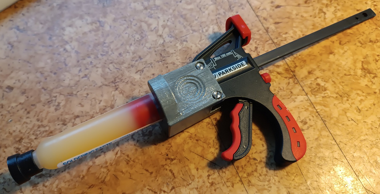 Já jsem si někde na Thingiverze našel STL přídavnýho bloku, kterým se z malý truhlářský svěrky z Lidlu udělá celkem solidní dávkovač. Flux to vytlačí levou zadní a zvládá i dost zahoustlou pájecí pastu. To ta rovná z prvního kvíčalova odkazu nedá ani náhodou.