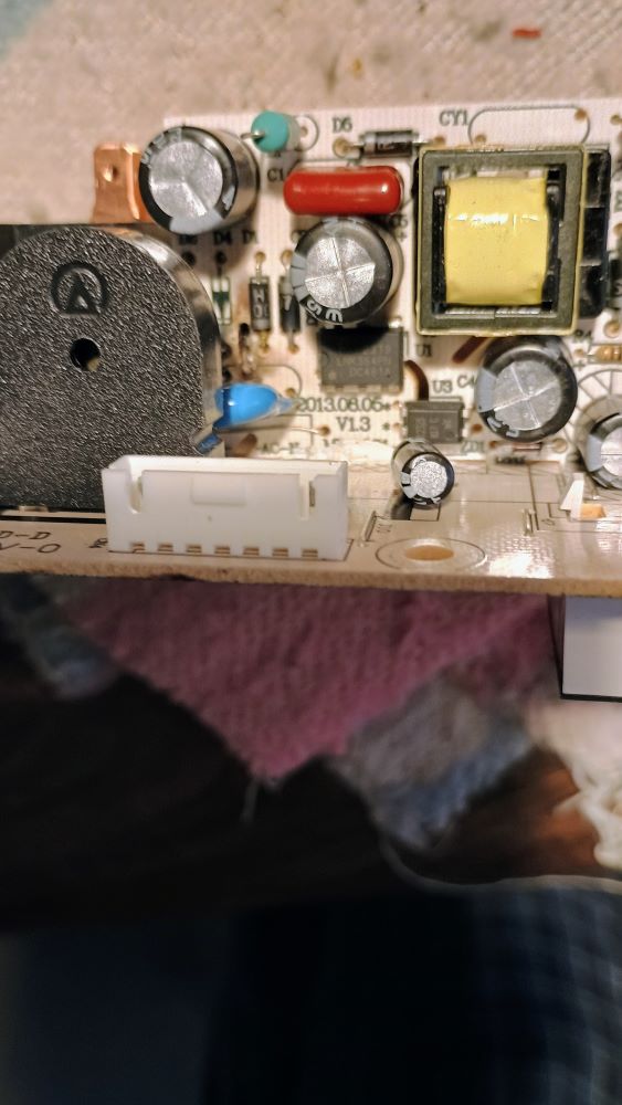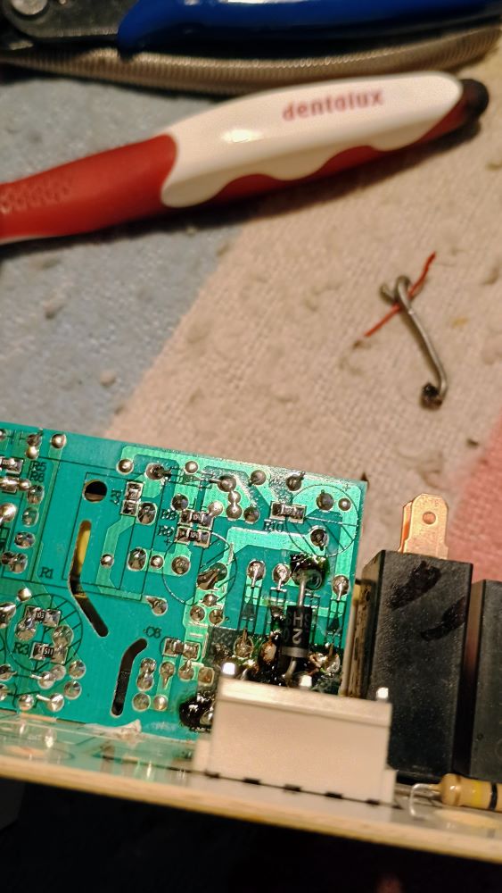 Dnes jsem rozebral tu mikrovlnku Elektrolux EMS4253TEX. Tu mikrovlnku zachránil varistor na vstupu karty elektroniku. Přepětím prorazil a vzal do nebe také proužky tišťáků v jeho přívodu. Ty spoje se zachovaly jako pojistka, doslova se vypařily. Ještě jsem vyměnil jednu diodu usměrňovače. Ten zkrat nějak upálil její nožku, ale diody to přežila.