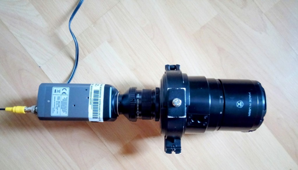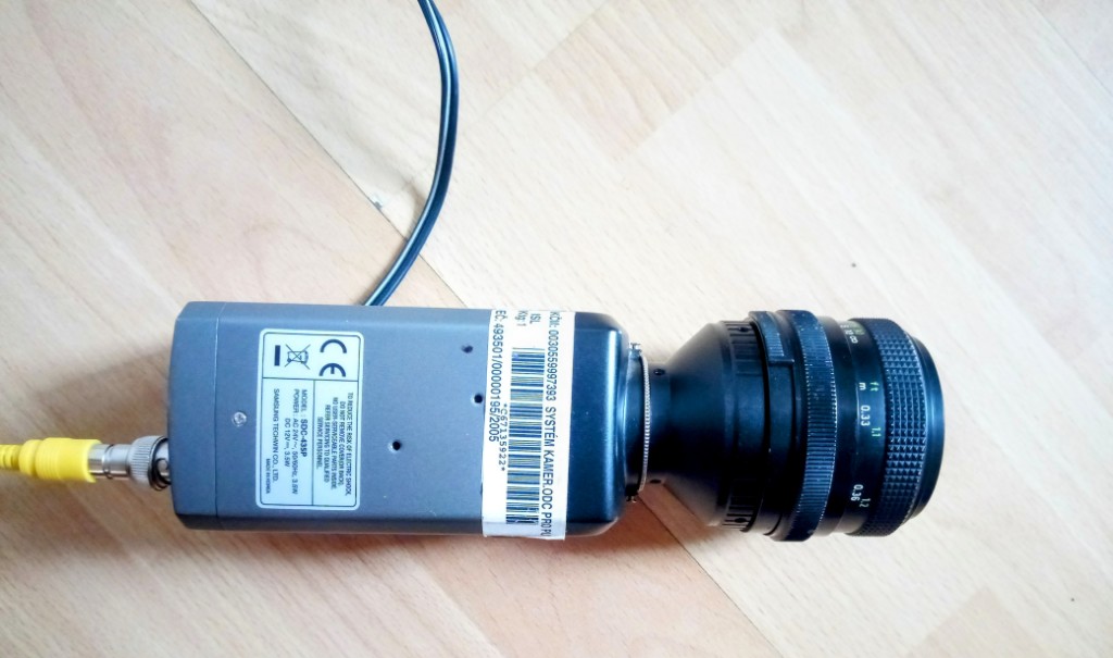 Zaobstaral som si túto použitú priemyselný kameru SDC-435 s teleobjektivom (bez možnosti ostrenia) a dokúpil ten menší objektív (s možnosťou ostrenia).