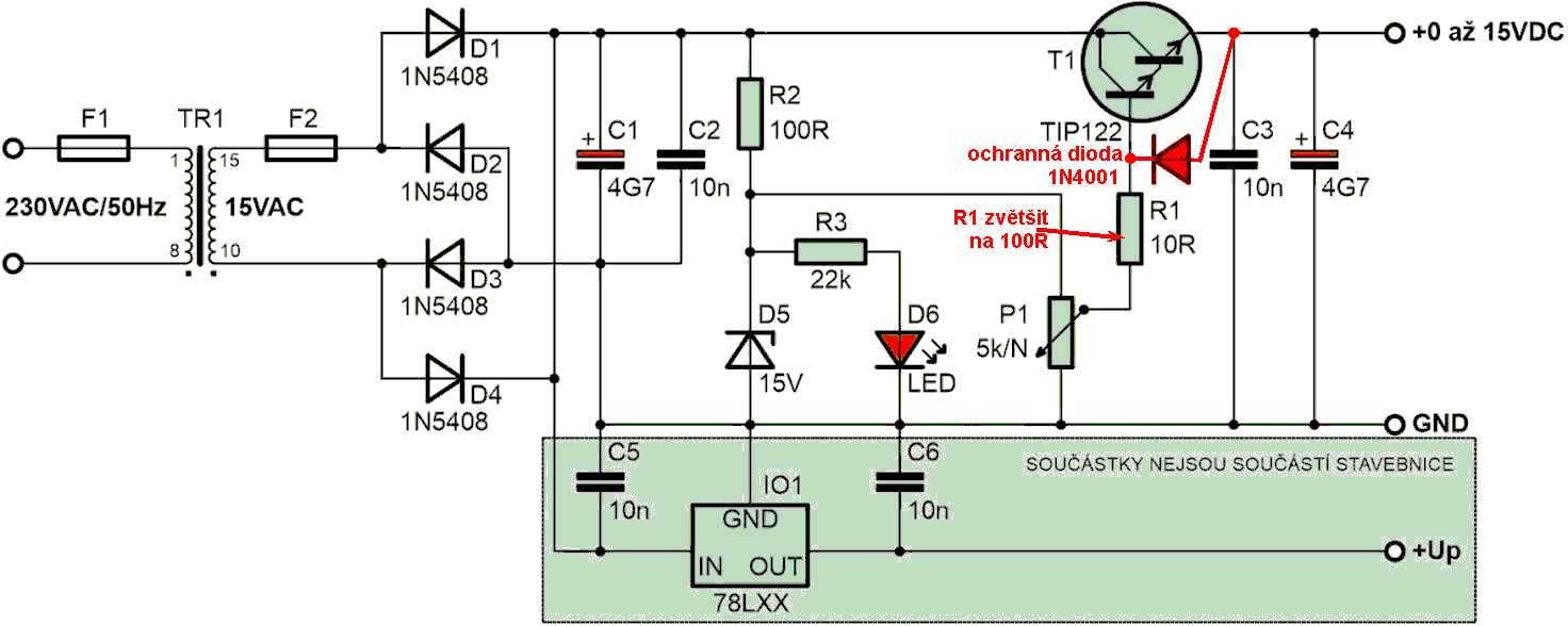Při použití zdroje pro nabíjení 12V akumulátorů rezistor R1 zvětšit na 470R