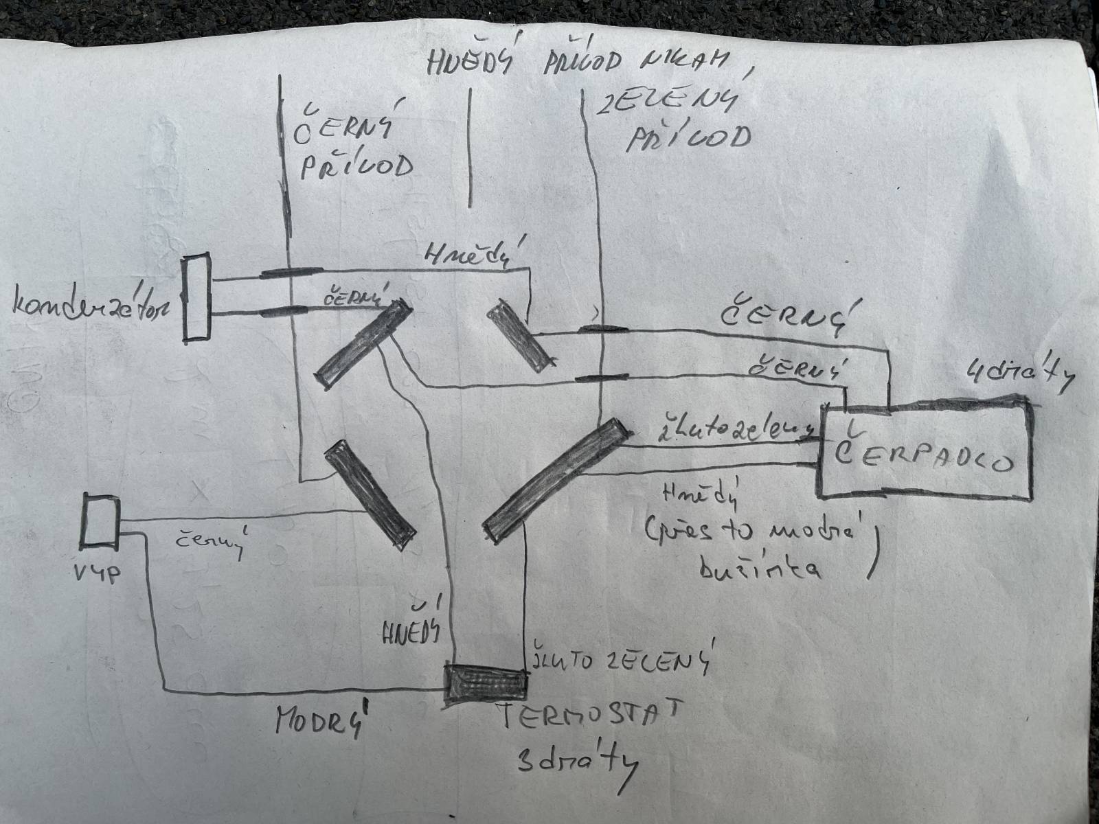 černý přívod na levou dtinku zástrčky, spojit s černým z vypínače, modrý z vypínače na termostat, hnědý z termostatu na druhý černý vývod čerpadla a černý z kondenzátoru.