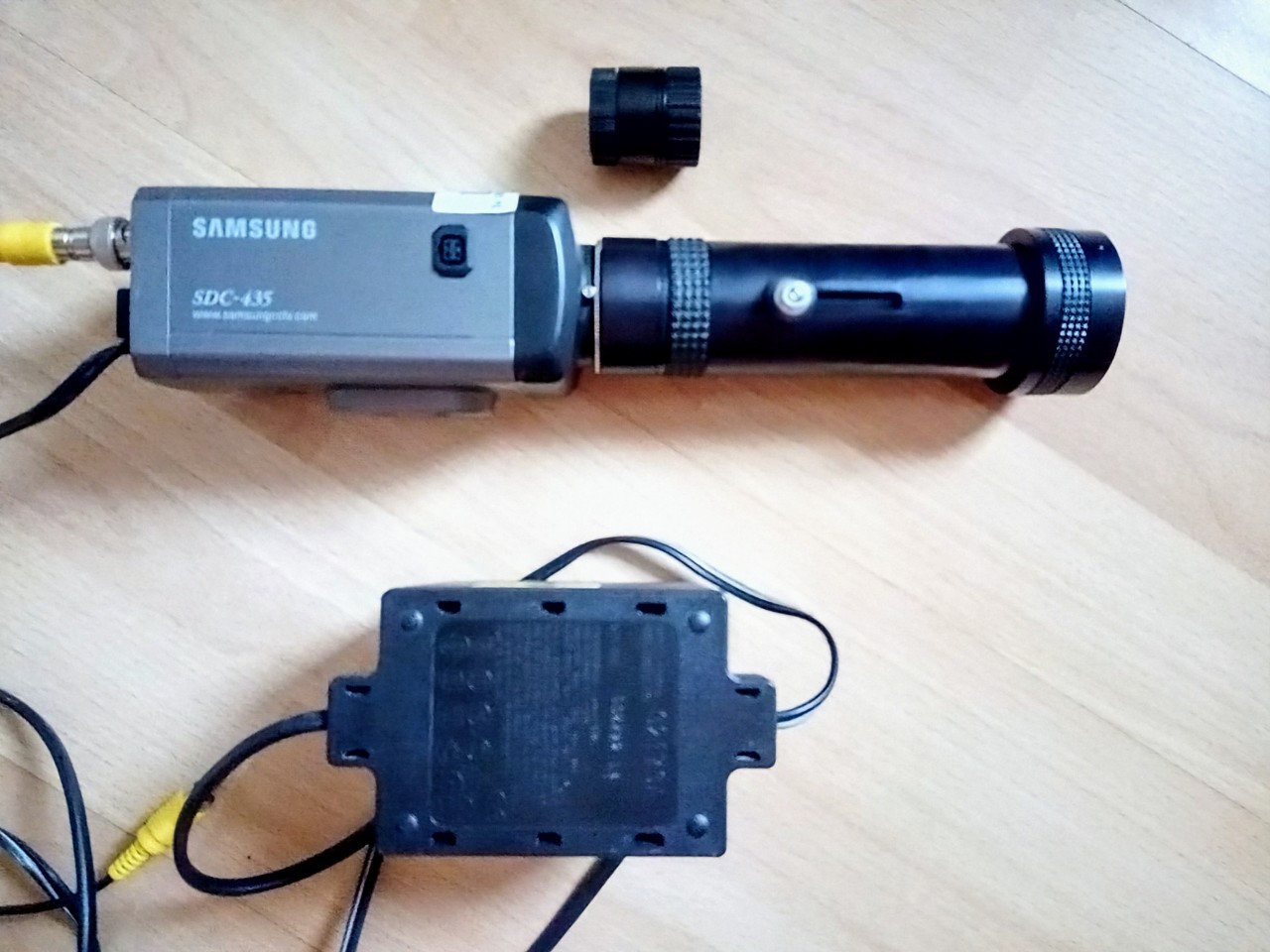 Zaobstaral som si túto použitú priemyselný kameru SDC-435 s teleobjektivom (bez možnosti ostrenia) a dokúpil ten menší objektív (s možnosťou ostrenia).