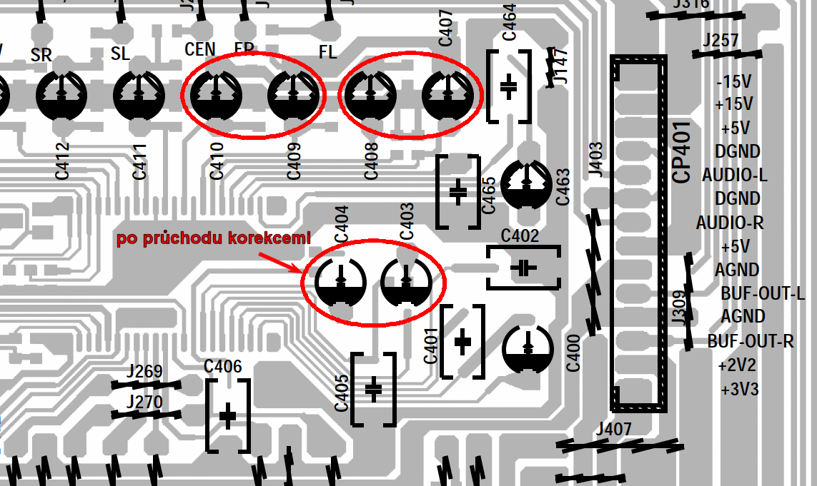 Nevíme, cos všechno měřil a kontroloval. V každém případě bych zkontroloval i výstupy z korekčního zesilovače, které nejsou ovládány k útlumu -∞, ale jen +-10dB, takže by na C403/404 mělo "něco" být.