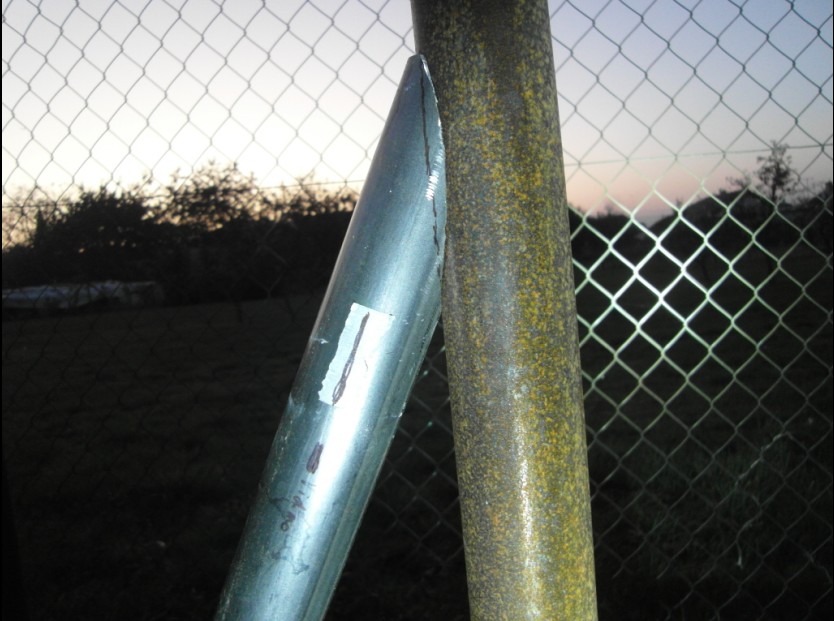 1. ku stojke Ø 50mm navariť vzperu Ø 40mm (obr.) --dtto 2x (obe 90cm pod zemou, dole od seba 90cm, zvar 90cm nad zemou, stojky zabetónované, šikmé vzpery ešte nie)