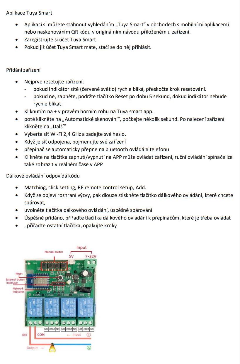 Pozdravujem všetkých a mám prosbu ohľadom problému rf ovládača 433MHz a jeho spárovania s doskou Tuya TYWB 4CH. V aplikácii TUYA Smart sa mi podarilo nastaviť ovládanie jednotlivých relé z mobiného telefónu, ale pri RF Remote control setup pre použitie malých tlačítkových ovládačov sa mi nedarí priradiť žiadny ovládač, každý pokus končí hláškou "The remote control button was not received over time". Funkcia ovládačov je overená. S aplikáciou nemám zatiaľ temer žiadne skúsenosti, ani na webe som nenašiel všetko, čo by som potreboval vedieť.