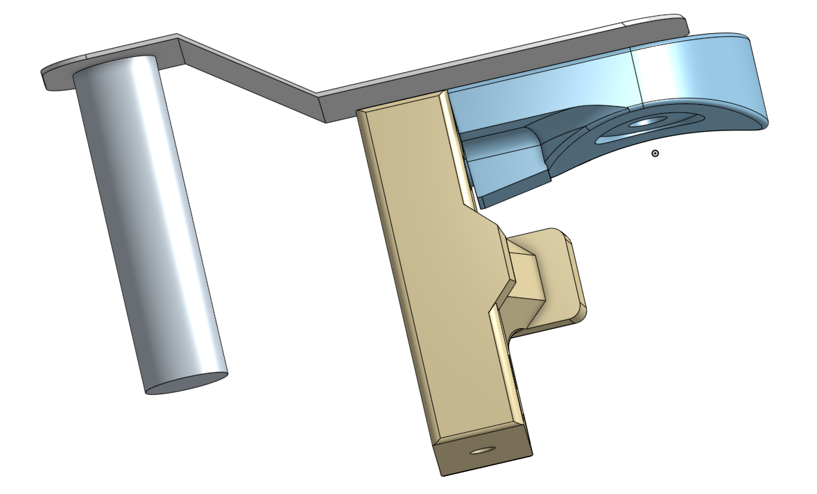 Jako první jsem provedl zkoušku pevnosti spodní části držáku. Při tisku 1mm stěny a 30procentní plnění držák testem neprošel. Použil jsem dost velkou sílu. PLA prasklo přes vlákna. Tudy cesta nevede. V místě zlomu jsem tedy vytvořil „kloub“a použil železo. Tím se síla převede na Fe plech 1,5x40 a při případné ráně držák zapruží ale nepraskne. Dosedací elipsovité plochy zůstanou z PLA směrované po vláknu. Pro jistotu jsem je vytisknul s 3mm stěnou při plnění 50procent. Tam problém nebude. Horní část ubastlím ze závitové tyče a plastové trubky navázané na ten plech. Kov je kov. Držák bude takové železné H místy podepřené plastem. Jenom PLA by nebylo bezpečné. Přece jenom jde o řetězovou pilu. Ale vypadalo to tak prďácky.