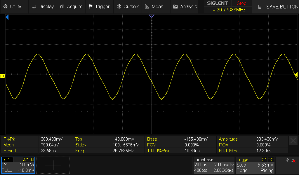 Oscilátor síce jednoduchý, stačí pripojiť LC a kmitá, ale priebeh nie je nijako extra spektrálne čistý. Záleži od frekvencii. Možno to nejako súvisí aj s rezonančným odporom. Skúsil som niekoľko cievok, rozsah 135 kHz až 29 MHz. Amplitúda na hornom konci klesne, ale dal som tam KSY81 namiesto KSY82.