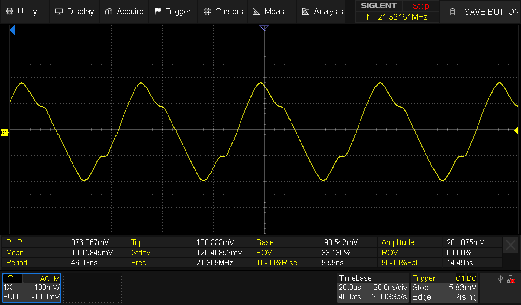AM je tristná, sínusová obálka sa prakticky nedá dosianuť, pretože sa moduluje priamo regulačná slučka oscilátora. Tá ma nejakú svoju časovú konštantu a hlavne pri vysokých frekvecniách už ide na doraz. Tak napr. na 20 MHz už ani nevidím, že VFO je modulovaný. Možno tak na 1%. Ale keď naladím na KV rádiu, tak tam hučí ten neviditeľný modulačný 1 kHz ako besný Smile