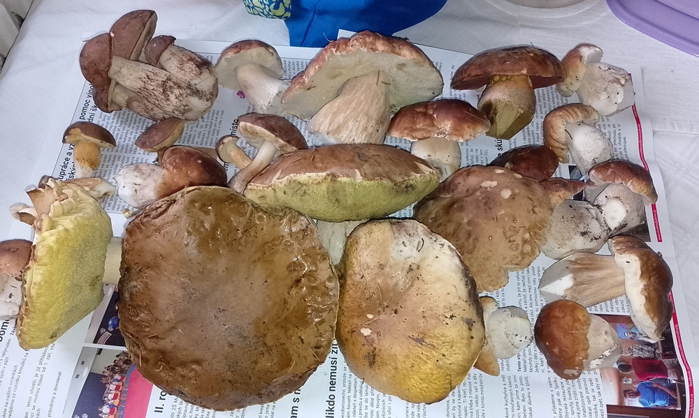Nebol som na hríboch tento rok vôbec - ten ischiatický nerv ma nejako nevie pustiť!! ale načistil som ich hodne.. nasušených je za 4 - 4L poháre a v sáčkoch ovarených zamrazených cca 6kg a bedle asi 30ks... synčok nanosil... Chytilo ho to.. Keď bol na víkend doma, vždy niečo doniesol.. Ešte aj z Rakúsov doniesol za tašku masliakov.. ale to už som odmietol pucovať!!