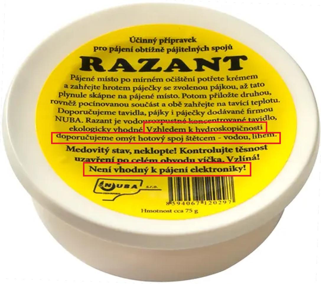 tak samozřejmě ten Razant nepatří do rukou amatéra, ale díky své agresivitě letování na neletovatelných místech umožní a důkladný oplach je nezbytný, na letování drátů v izolaci bych byl opatrný. Ale v podstatě včechna tavidla jsou problematická. A pamatuji jak mě vyškollily svody které dělala kalafuna.