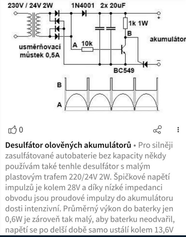 Osobně o desulfataci nic nevím, jen se mi ty pulsy z toho jednoduchýho zdají pocitově slabý no. Ten spínanej z elektrolabu prostě dává větší pecky.