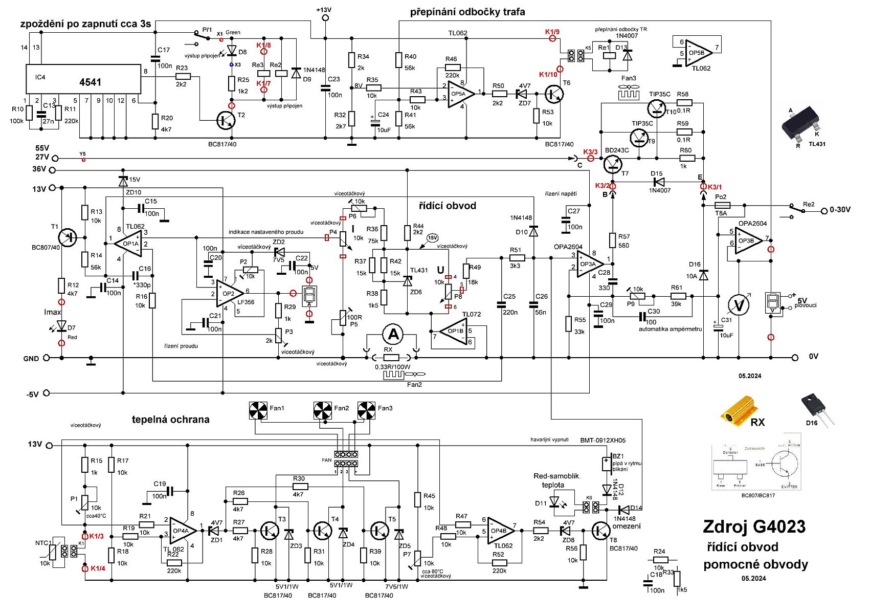 6. Stabilizovať napájanie všetkých OZ tak aby zdroj mohol korektne fungovať keby sa použilo prepínanie odbočiek. Príde mi nevhodne že jeden sa napája od 36V druhy od 13V. Ideálne keby všetky sa napájajú od 27/ 55V s tým že sa im stabilizuje napájanie napríklad na 12V.