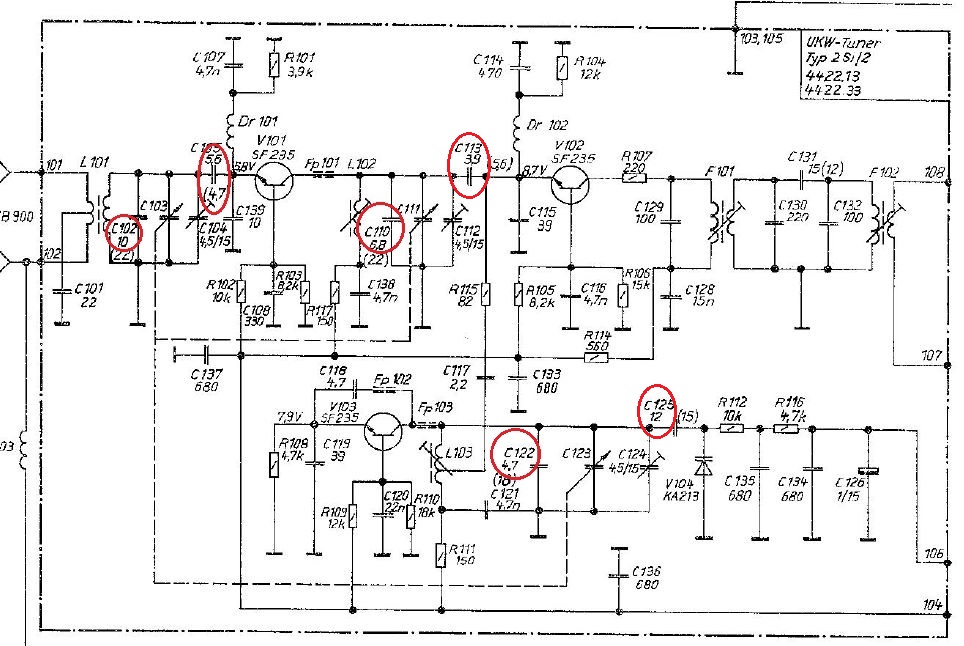 Mám tu podivnou záhadu. Vyměnil jsem kondenzátory, nedělám to poprvé ale tentokrát úplné NIC, tím myslím žádných 10,7MHz na výstupu. Běžně se to chová tak, že po výměně kondenzátorů lze zachytit aspoň nějakou silnou stanici a pak už jenom doladit, no narazil jsem. Takže další pokus - na dalším tuneru (s číslicovou stupnicí) jsem nastavil 108MHz, pak jsem naladil oscilátor v přelaďovaném kusu, ten by teď měl být připraven přijímat 97,3MHz. Pak jsem nastavil digitální tuner na 87,5, jeho oscilátor je tedy na 98,2MHz. Při přiblížení antény k tuneru digitálního přijímače už by mělo být po pokroucení laděním na nastavovaném přístroji na osciloskopu vidět aspoň něco, nevidím NIC! Osciloskop jsem připojoval přes 20pF za F102, na C131, na oba konce R107 a nikde nic. Zkusil jsem odpojit C113 a přivést signál (drát v blízkosti tuneru digitíálního přístoje) přes 5pF na E V102, vypájet C115 a pořád NIC. Teď dotaz - dělám něco úplně špatně, mě napadá už jenom že V102 nezesiluje, je to možné? Jinak nevím co dál... Výměna tuneru je možná ale tohle je VÝZVA! Přece nemůže zvítězit tupá hmota.