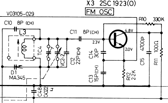 Znamená to vyměnit prakticky všechny kapacity v obvodu tranzistoru X3 a to nejlépe všechny najednou - je to méně pracné. Vf keramické kondenzátory nemusí mít jen svod, častěji trpí ztrátou kapacity, což se bez demontáže měřit stejně nedá. Naměřená napětí na tomto tranzistoru tomu napovídají. Pokud oscilátor kmitá, zvýší se proud tranzistorem a rázem budou napětí na něm tam, kde mají být. Ve hře jsou i studené nebo prasklé spoje v blízkosti ladícího kondenzátoru (mechanicky namáhané spoje). Ale pokud je vadný "jen" oscilátorový obvod, není toho tolik - viz obrázek.