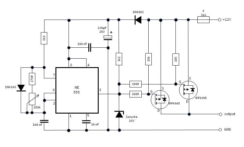 Ta zenerka na výstupu 555 tam vypadá dost nesmyslně. Jestli měla chránit FETy, tak patří mezi G a S, tj. vůči + napájení a ne vůči zemi. Jaká že je její funkce?