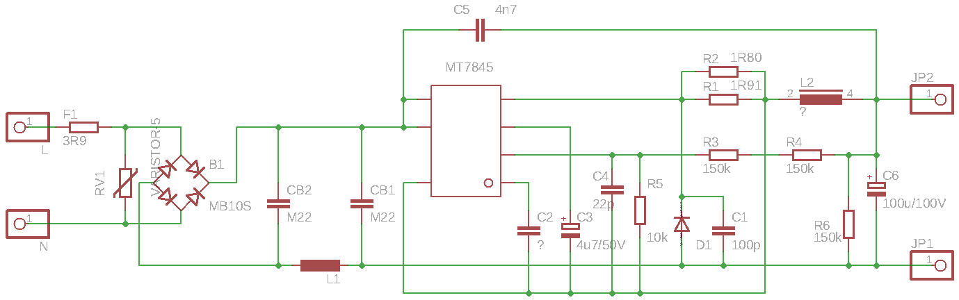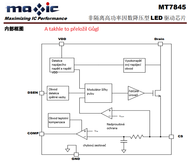 Kolega v práci mi dal venkovní LED světlo 12W s označením Avila D, že bliká jako stroboskop. Je v něm deska s 16x2 LED a krabička zdroje proudu 230 mA 30-80V s označením YD12230CN. LEDky na vnější zdroj svítily, při 230mA na nich bylo 48V, tak jsem kuchla ten zdroj. Je v něm nějaký čínský integráč MT7845, ke kterému je na netu obsáhlý 1 str. datašít. Z něj jsem se dočetla, jak je ten integráč úžasný, ale jinak nic moc. Nakreslila jsem z destičky schéma. Jsou tam dva elyty, na výstupu 100uF/100V, ten se jevil dobrý, druhý 4u7/50V pravděpodobně filtruje napájení IO. Ten měl dost velké ESR, tak jsem ho vyměnila a světlo na stole svítí. Uvidím, jestli při nižší teplotě nezačne zase blikat.