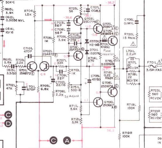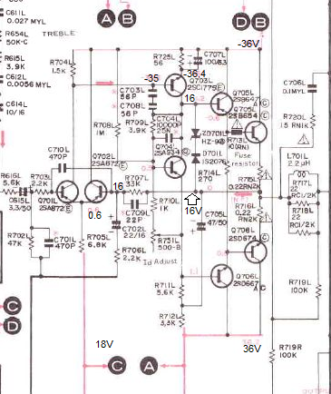 Tak jsem změřil napětí na některých odporech (po výměně C702 a C705). Ve schematu jsou uvedená v mV, před lomítkem nefunkční, za ním funkční konec. Z nějakého důvodu je málo otevřený Q703, (nebo Q701). Napětí 13V na C je správně, v původním obrázku jsem to napsal špatně. Zkrat na C701 by víc otevřel Q701(?). Dodatek - osciloskop kmitání na výstupu neukazuje.