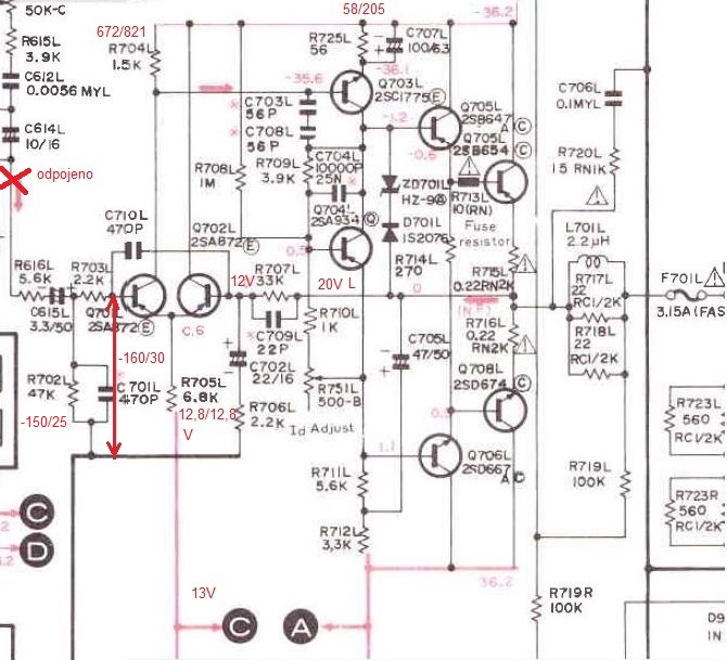A potom je záhada, odkiaľ je na emitore Q701L 0.6 asi V. Odťial, až po ten Q703L je niekde chyba.