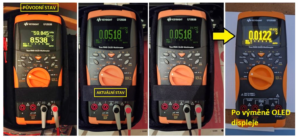 Ahoj, ano, u verzí těchto multimetrů s OLED displejem první verze byl/je problém. Prý dochází k pronikání vzduchu, vlhkosti přes těsnící hmotu do displeje. To způsobuje chemickou degradaci organické látky OLED displeje. U nové verze OLED je to prý již pořešeno novým materiálem. Kupoval jsem si k Vánocům pod stromeček 11/2016 v TME typ KEYSIGHT TECHNOLOGIES U1253B a nedávno (8/2024) jsem displej musel pořešit. Po necelých 8 letech již znatelně odumírá OLED displej. Jeho svítivost v poslední době najednou znatelně poklesla, odhaduji tak na 20% původní svítivosti (v režimu max. svítivosti) a jsou vidět i rozdíly svítivosti i mezi samotnými „pixely“, jednotlivými LED. Multimetr je jinak plně funkční, bez jakékoliv jiné vady. Poptával jsem displej u autorizovaného servisu této značky u nás - htest.cz, tam jsem moc nepochodil. Né kvůli tomu, že by výměnu nezařídili, ale ... Neprovádějí to sami (Keysight tento díl samostatně neprodává), posílají to do Německa - výměnu provádí přímo v servisním centru Keysight v Boeblingenu GE. Ale cena je zhruba (i s DPH) cca 10kKč !!! Čož je úplný nesmysl. Cenu si nevymýšlím, je přímo od technika z Htestu. Proto jsem s díky nabídku odmítl a řešil jsem to po vlastní ose. Našel jsem v Německu firmu, která takovéto problémy řeší u všech možných zařízení s OLED displejem. Jedná se o fi. LC Design, u které jsem náhradu našel. Jde o jejich design, nově osazenou DPS - modul OLED nového typu, s novým řadičem (Solomon Systech SSD1309 o.a.) Za cca 80EUR vyřízeno, doma jsem ho vyměnil a je opět v plné síle.